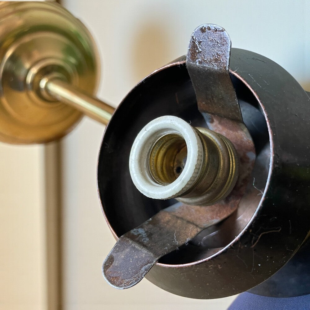 This pair of wall sconces was made in Portugal in the 1990s. The sconces are in metal, with green glass lampshades.