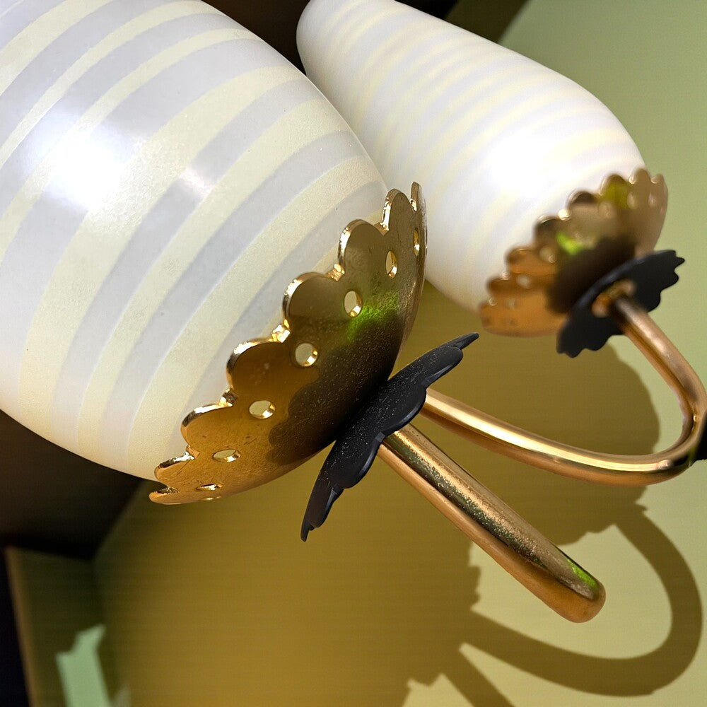 Made of metal, chromed gold, with 2 glass lampshades decorated with stripes. Equipped with 2 bayonet E14 light bulb sockets.