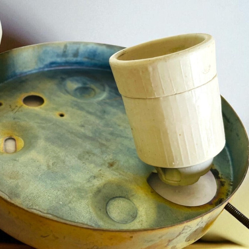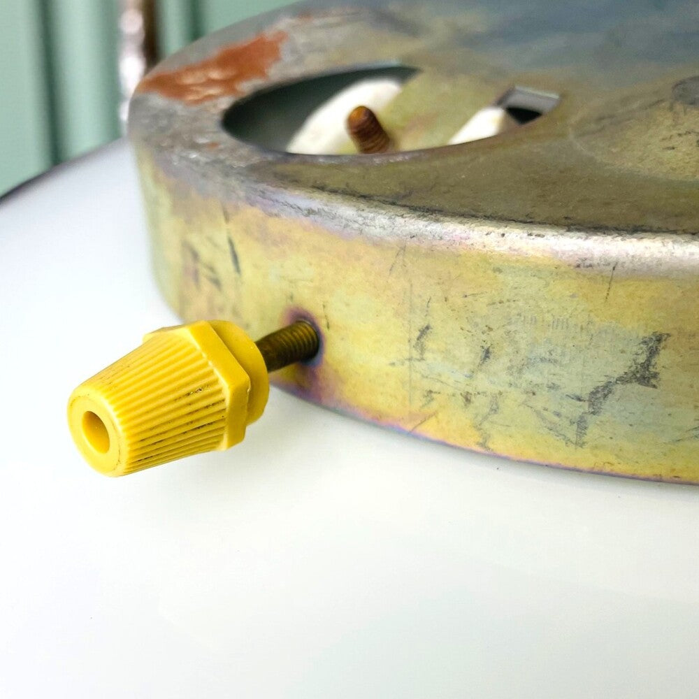 They are made of white opaline glass and equipped with an industrial-style steel mounting base.