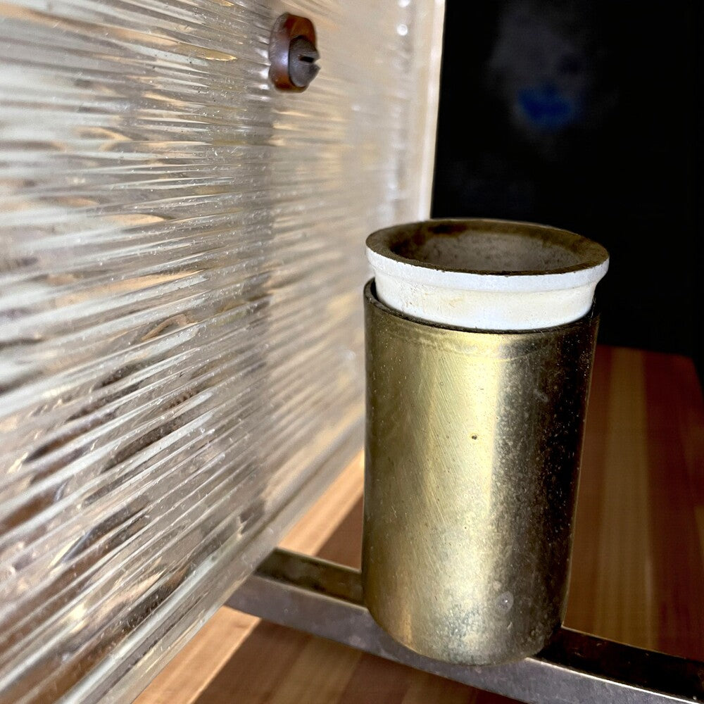 Modernist wall sconce light, made of a brass frame and a textured Murano glass diffuser panel.