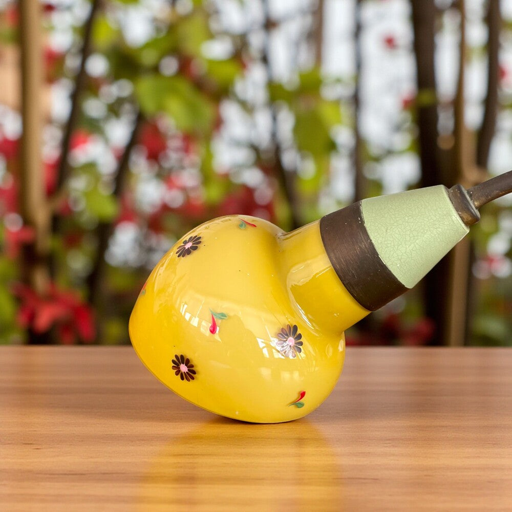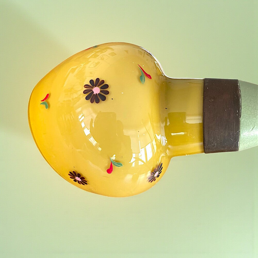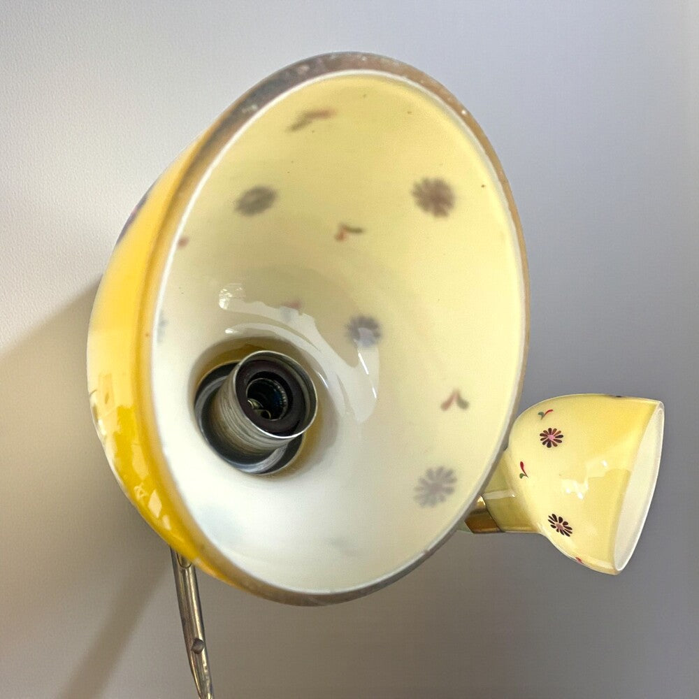 The structure is made of brass, the lampshades are in opaline yellow glass, with hand-painted floral design. Original green painted brass parts and patina.