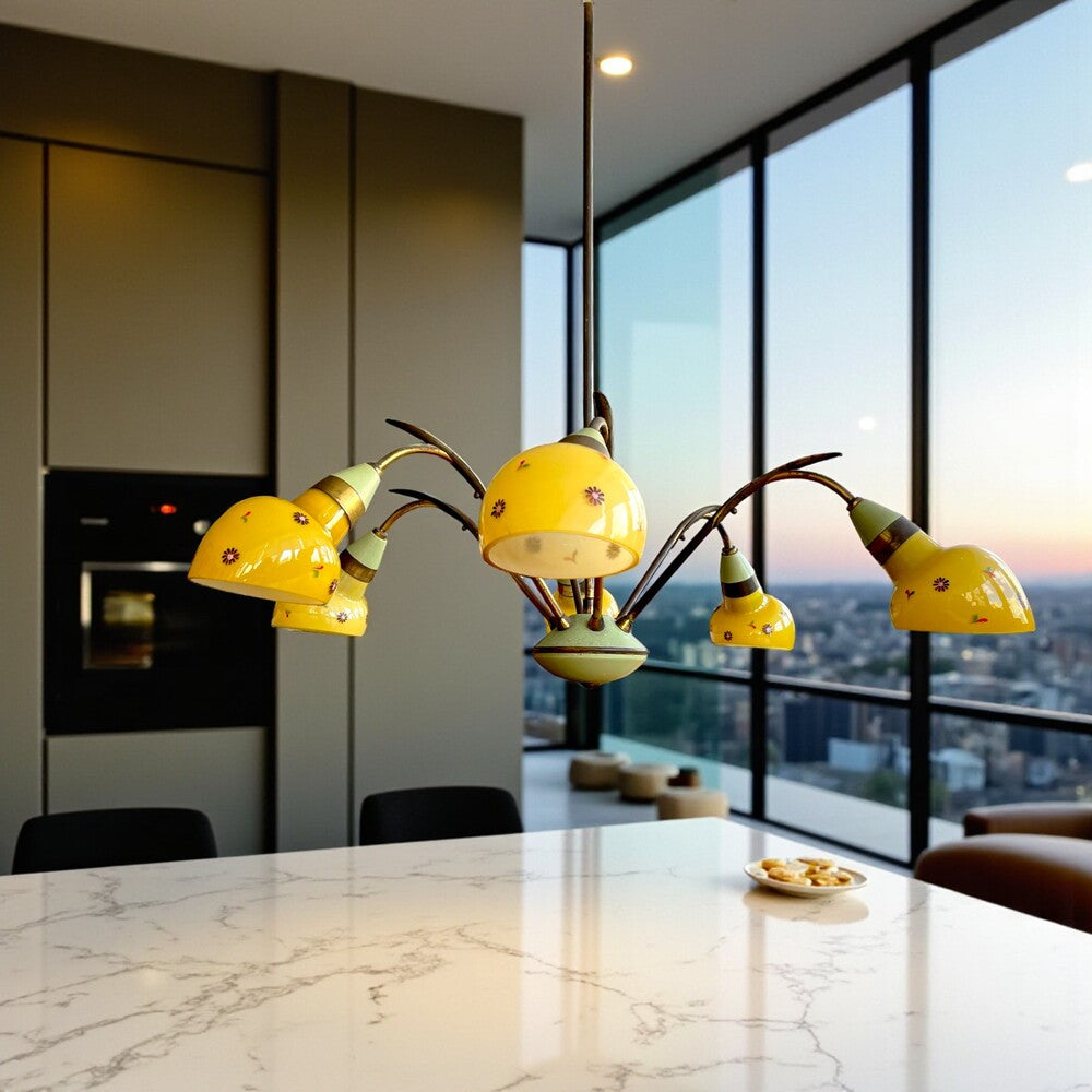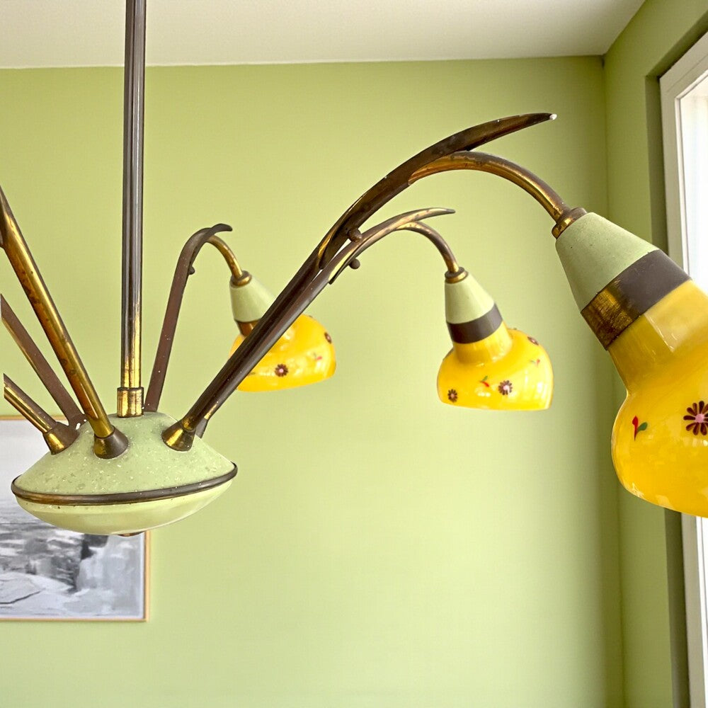 Amazing Spider chandelier with 6 lights, from the 1940s. This is a rare case when we have all 6 original glass lampshades in excellent condition.